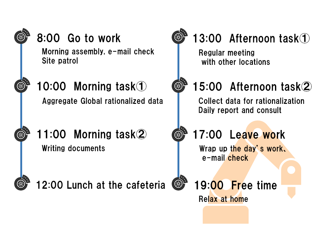 I am in the machine technology department, and I am responsible for providing technical support to domestic and overseas sites, with a primary focus on total cost-reduction efforts. My primary responsibility is to enhance productivity and reducing costs through process improvement and equipment optimization. We respond flexibly according to the situation on site and contribute to improving manufacturing efficiency from a technical perspective.